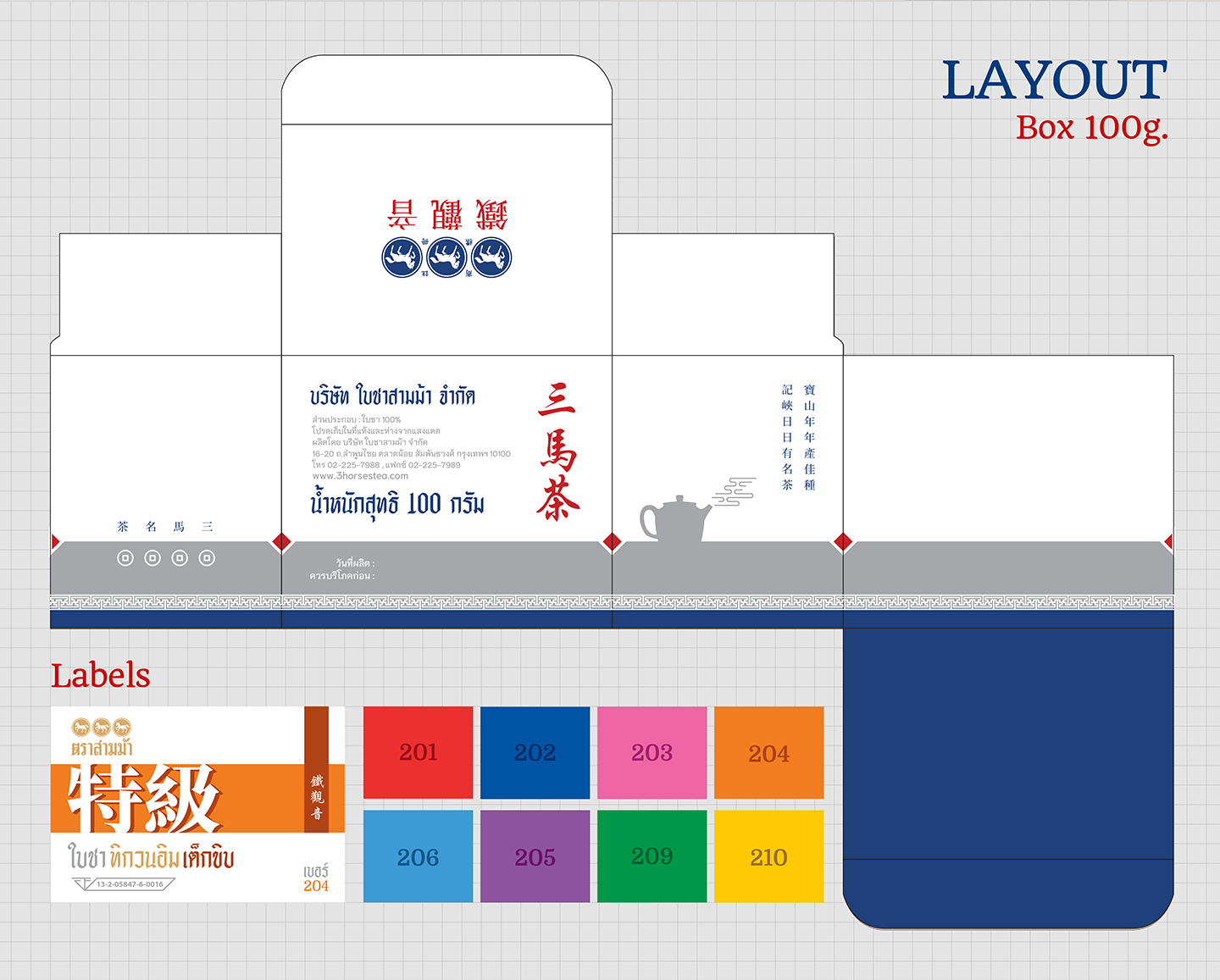 โดยกล่องนั้นเราใช้สี ขาว / แดง / น้ำเงิน ที่มาจากแบบสินค้าดั่งเดิมหนึ่งตัวเป็นสีหลักเพื่อไม่ให้ลูกค้ารู้สึกสับสนเกินไป จนไม่คุ้นชิน เน้นการออกแบบที่เรียบง่ายและร่วมสมัย เข้าถึงกลุ่มคนได้ทุกเพศทุกวัย ส่วนฉลากก็ออกแบบในทิศทางเดียวกันเพื่อให้กลมกลืนไปกับกล่อง แล้วมาเน้นการใช้สีสดในแต่ละชนิด ให้โดดเด่นสะดุดตาแทน