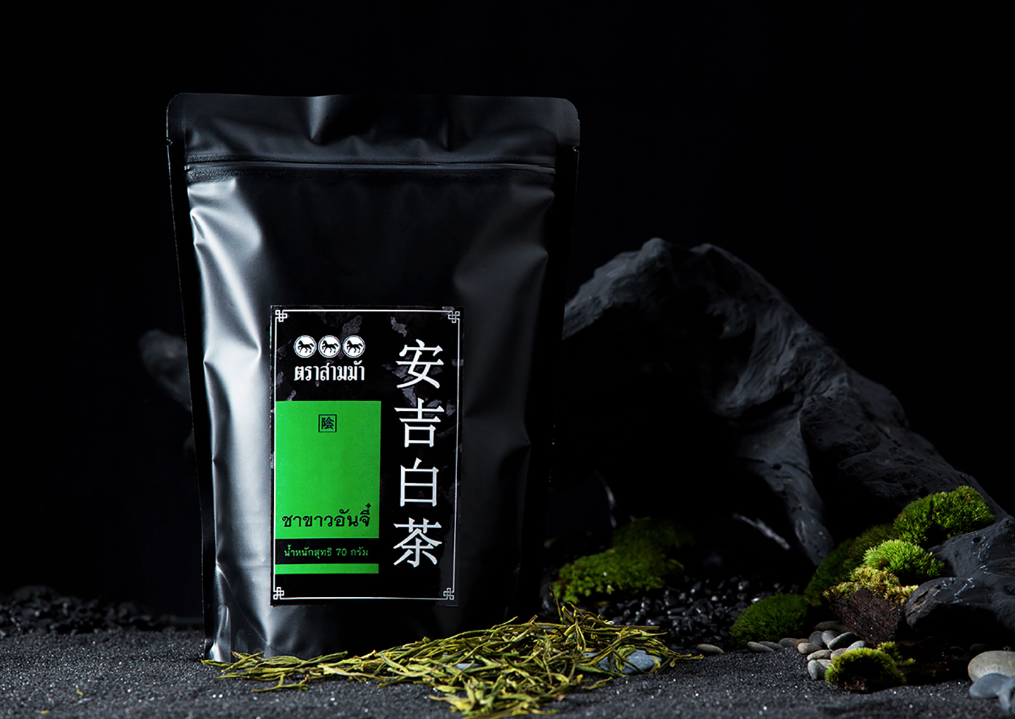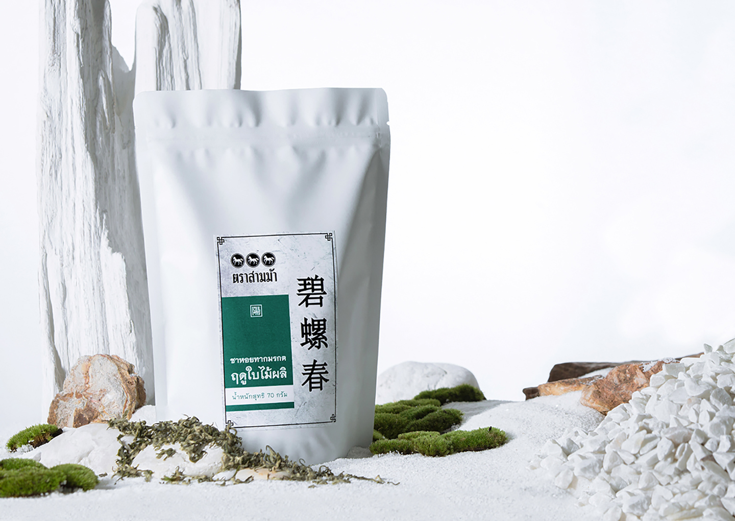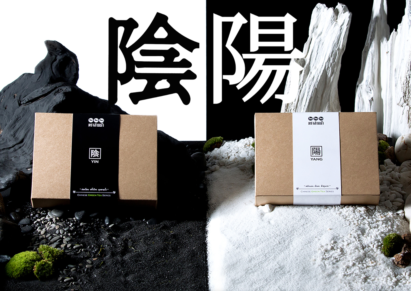 สินค้าประกอบไปด้วยชา 6 ชนิด ด้วยจำนวนที่มาก ทำให้สื่อสารได้ยากจึงแบ่งครึ่งออกเป็น 3-3 เพื่อให้ง่ายขึ้น และรวบขึ้นอีกเป็น 1-1 ด้วย Concept ขาว/ดำ และแน่นอนเมื่อคิดถึงสีขาวและดำในวัฒนธรรมจีนจึงหนีไม่พ้น สัญลักษณ์ หยิน-หยาง ที่มีความหมายถึงกลางวัน กลางคืน , ความสว่าง ความมืด , ความร้อน ความเย็น เมื่อคิดขึ้นได้แบบนั้น จึงย้อนกลับไปเป็นไอเดียแบ่งกลุ่มชา 3-3 เป็น หยิน = ชารสชาติเบา / หยาง = ชารสชาติหนัก นั้นเอง โดยมีการนำสีเขียวที่ตรงกับพันธุ์ชาเขียวในซีรี่มาแตกกระจายออกเป็น 6 โทนสีเพื่อบ่งบอกถึงสินค้าแต่ละชนิดอีกทีนึง โดยใช้หลักทฤษฎีสีในการออกแบบที่ 80-20 ในการกำหนดภาพร่วมนั้นเอง