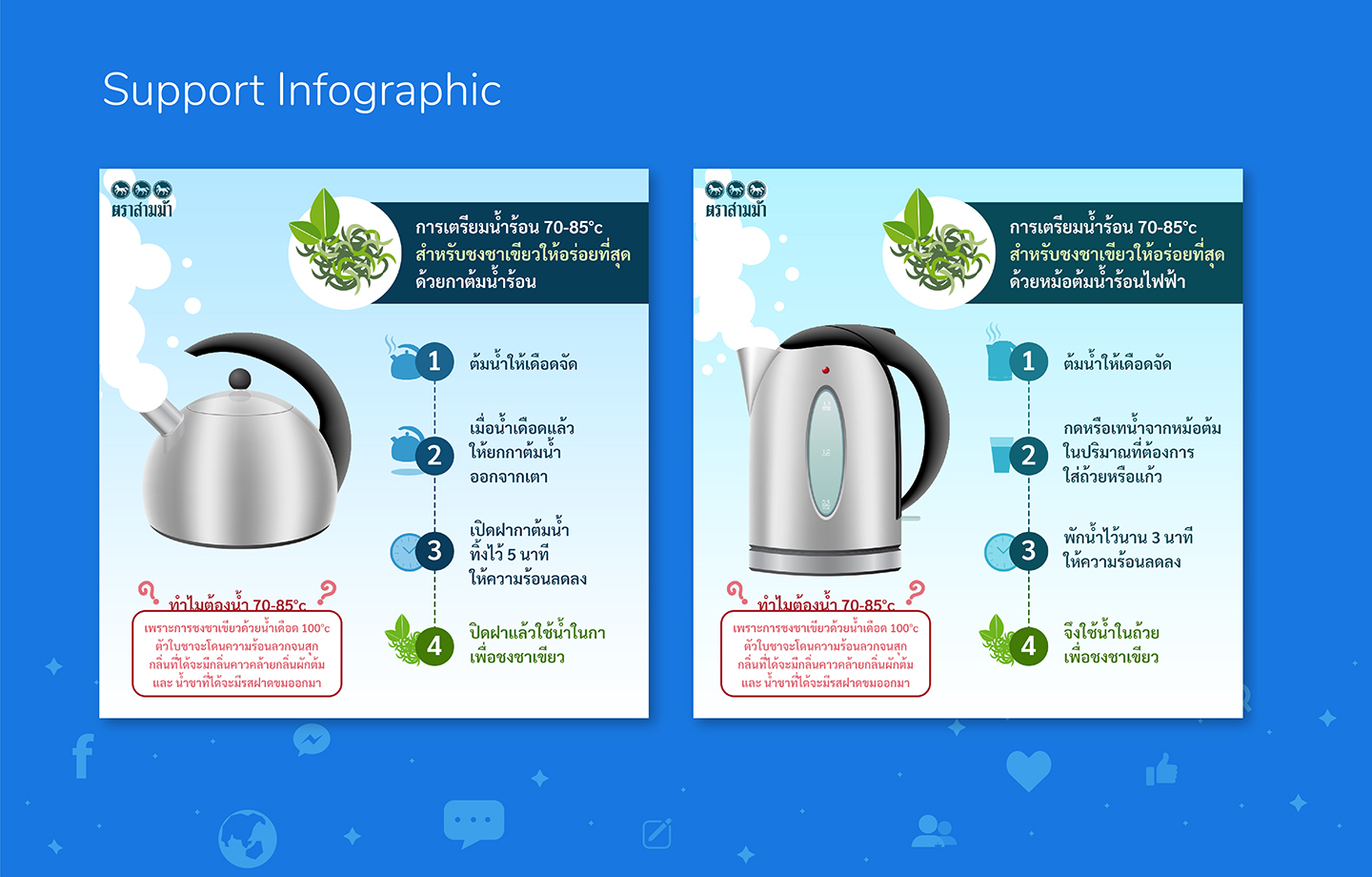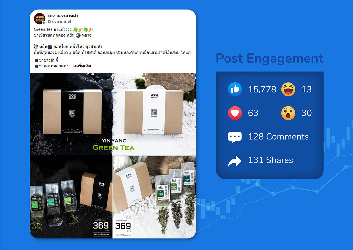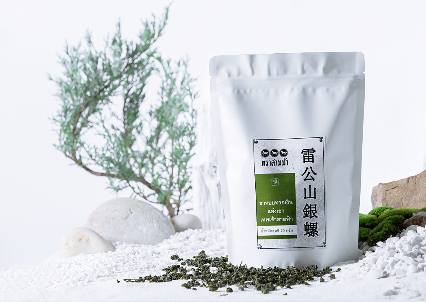 สินค้าประกอบไปด้วยชา 6 ชนิด ด้วยจำนวนที่มาก ทำให้สื่อสารได้ยากจึงแบ่งครึ่งออกเป็น 3-3 เพื่อให้ง่ายขึ้น และรวบขึ้นอีกเป็น 1-1 ด้วย Concept ขาว/ดำ และแน่นอนเมื่อคิดถึงสีขาวและดำในวัฒนธรรมจีนจึงหนีไม่พ้น สัญลักษณ์ หยิน-หยาง ที่มีความหมายถึงกลางวัน กลางคืน , ความสว่าง ความมืด , ความร้อน ความเย็น เมื่อคิดขึ้นได้แบบนั้น จึงย้อนกลับไปเป็นไอเดียแบ่งกลุ่มชา 3-3 เป็น หยิน = ชารสชาติเบา / หยาง = ชารสชาติหนัก นั้นเอง โดยมีการนำสีเขียวที่ตรงกับพันธุ์ชาเขียวในซีรี่มาแตกกระจายออกเป็น 6 โทนสีเพื่อบ่งบอกถึงสินค้าแต่ละชนิดอีกทีนึง โดยใช้หลักทฤษฎีสีในการออกแบบที่ 80-20 ในการกำหนดภาพร่วมนั้นเอง