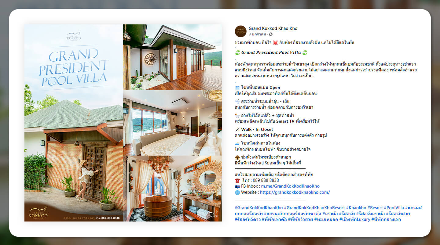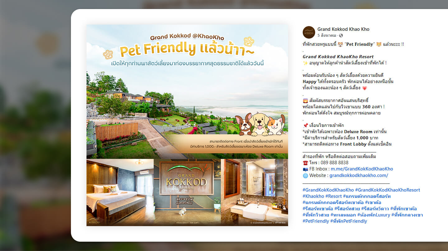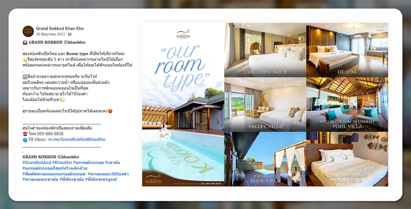 นำเสนอรายละเอียดข้อมูล สิ่งที่เกี่ยวข้อง ความพิเศษต่าง ๆ ของที่พัก มาจัดทำโพสต์ทั้งรูปภาพและวิดีโอเพื่อให้สามารถดึงดูดลูกค้าได้หลายช่องทาง แบ่งหมวดหมู่หัวข้อ เพื่อนำเสนอจุดเด่นที่ต้องการแนะนำภายในเพจแต่ละเดือน ให้ลูกค้าได้เลือกหัวข้อที่ต้องการได้ตามใจ