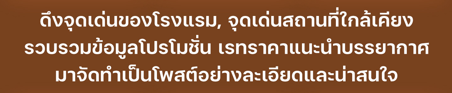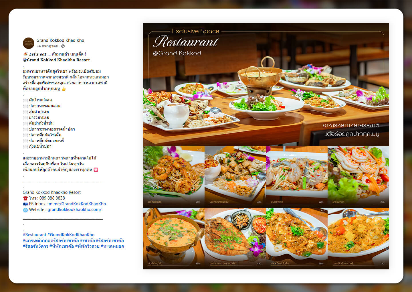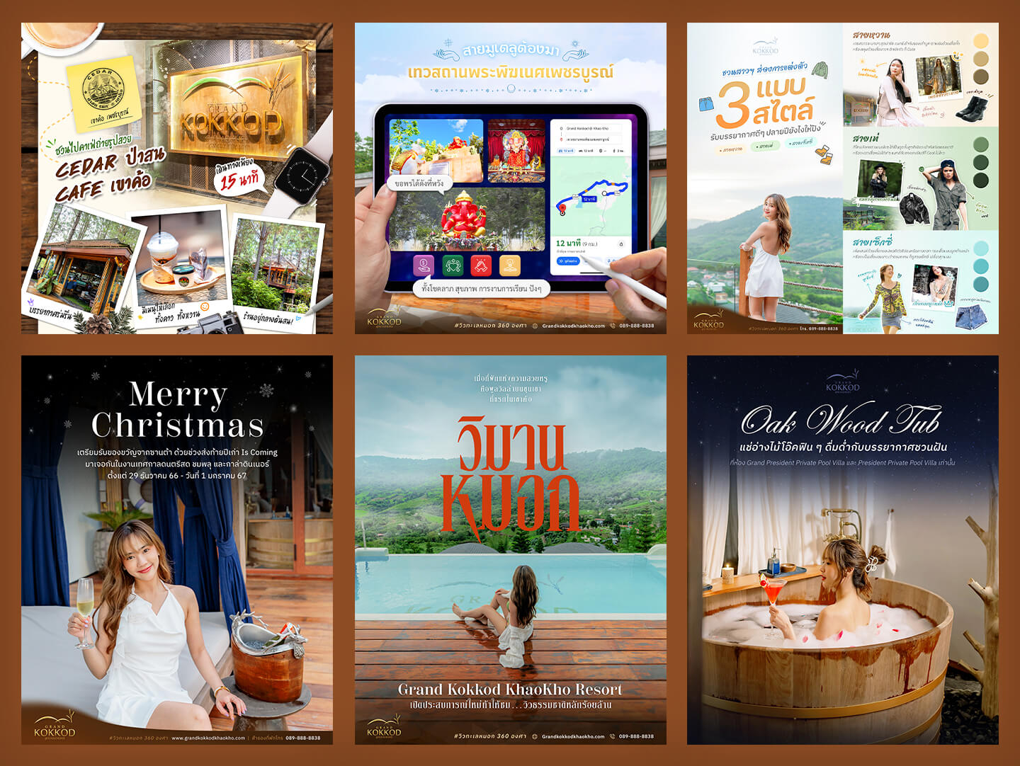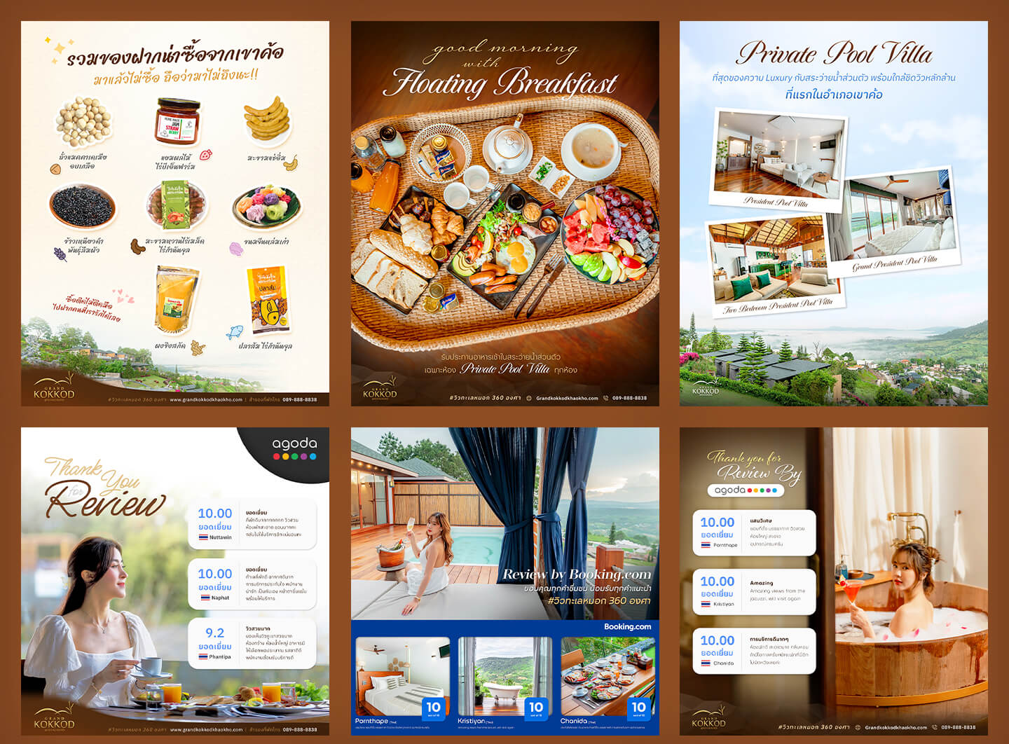 นำเสนอรายละเอียดข้อมูล สิ่งที่เกี่ยวข้อง ความพิเศษต่าง ๆ ของที่พัก มาจัดทำโพสต์ทั้งรูปภาพและวิดีโอเพื่อให้สามารถดึงดูดลูกค้าได้หลายช่องทาง แบ่งหมวดหมู่หัวข้อ เพื่อนำเสนอจุดเด่นที่ต้องการแนะนำภายในเพจแต่ละเดือน ให้ลูกค้าได้เลือกหัวข้อที่ต้องการได้ตามใจ