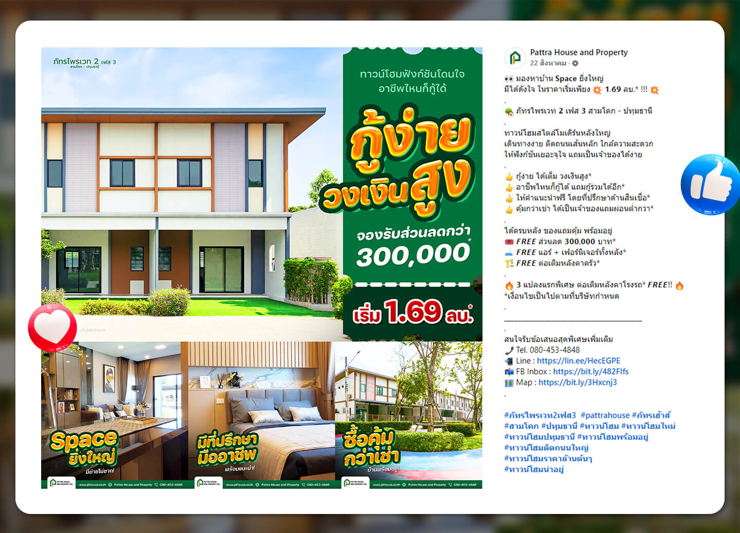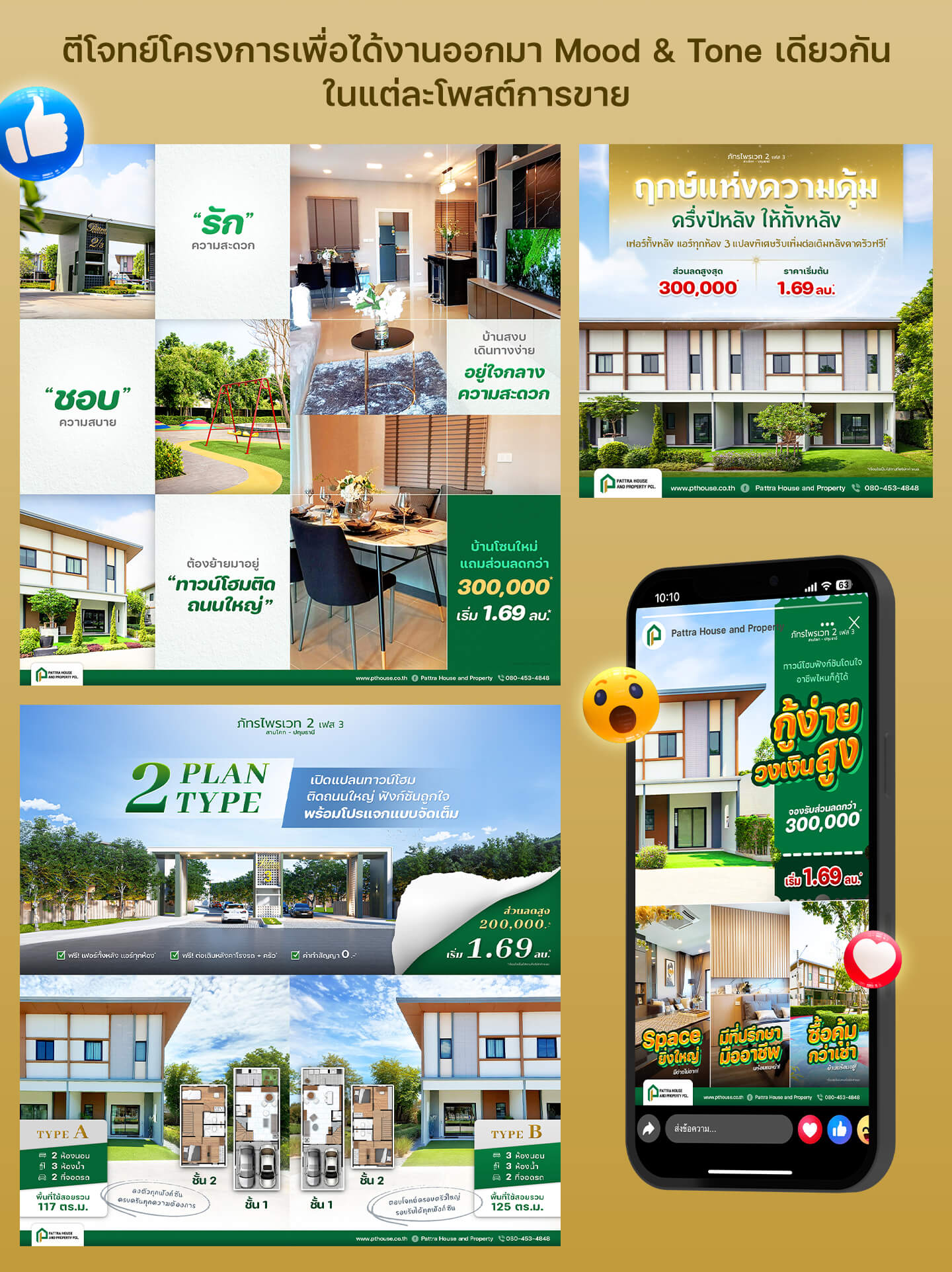 นำข้อมูลที่มีทั้งหมดมาจัดทำโพสต์รายละเอียดโครงการให้สวยงาม แม้มีเพียงภาพ 3D ก็สามารถนำมาทำการตลาดได้หลากหลายหัวข้อ หรือต้องการภาพจริงในโครงการ ก็มีทีม Production จัดถ่ายทำให้ถึงหน้างาน พร้อมจัดหานางแบบที่้เหมาะสมกับโครงการ เพื่อให้โครงการดูมีชีวิตชีวา จากการจ้างนางแบบมาช่วยแนะนำ