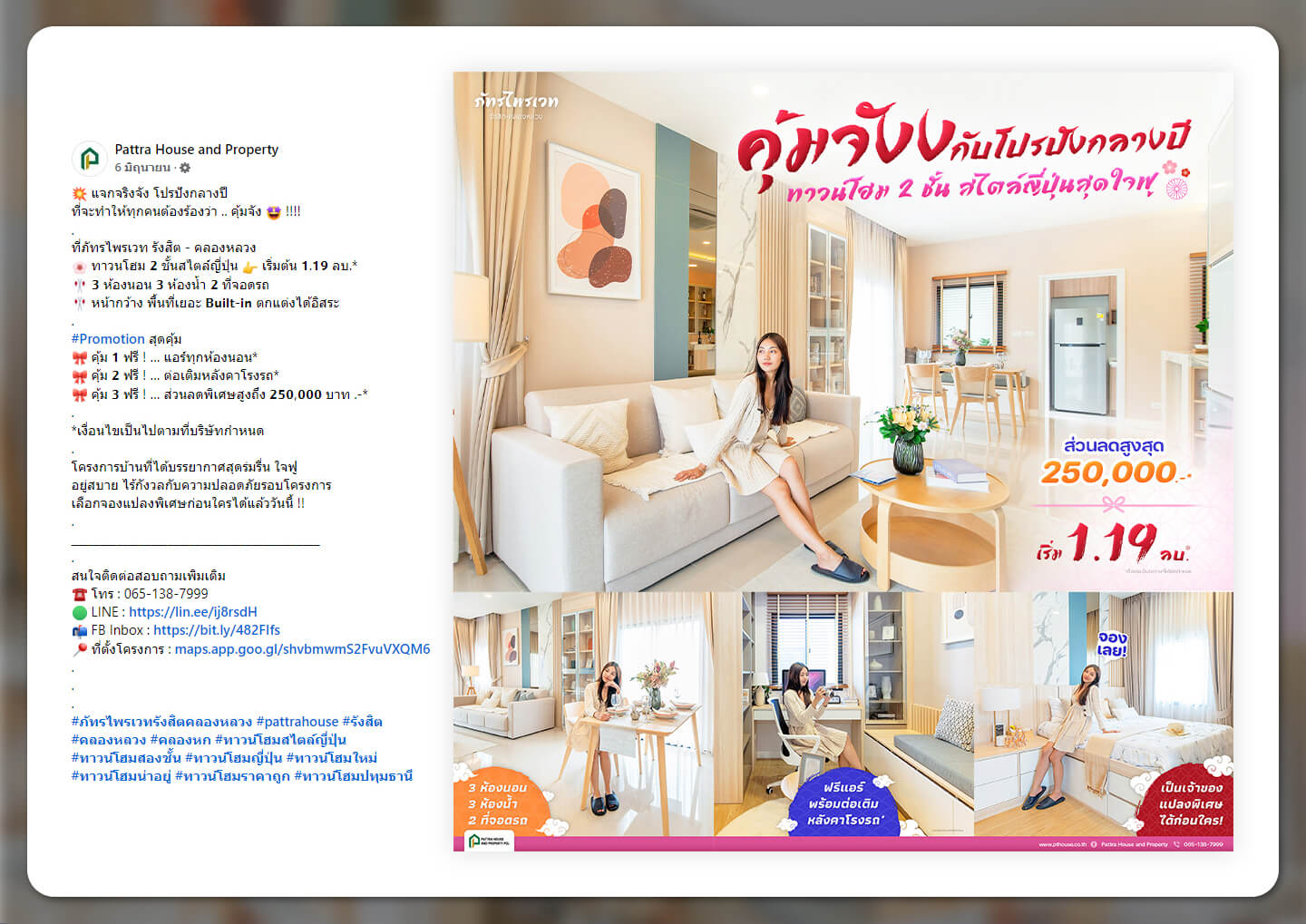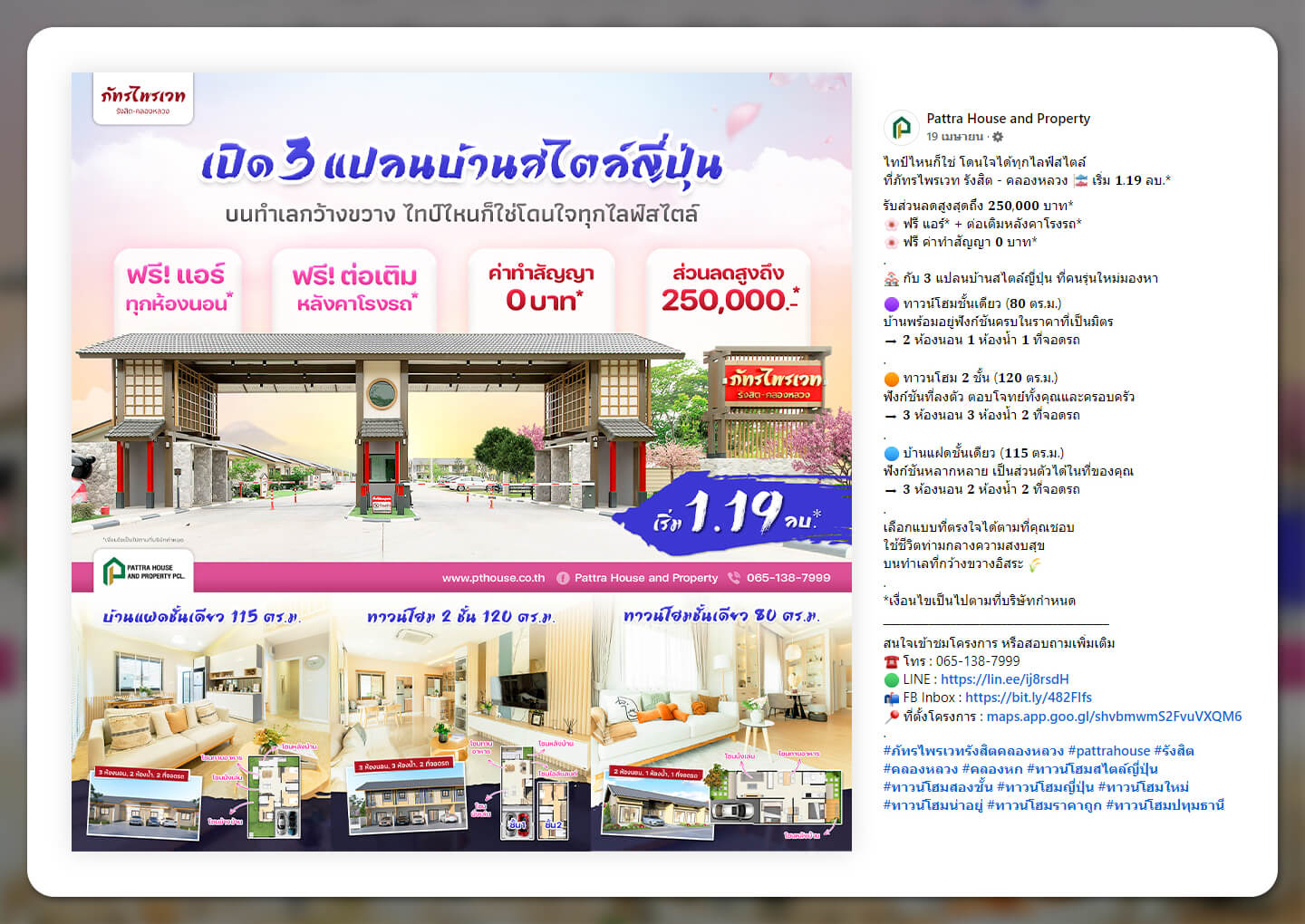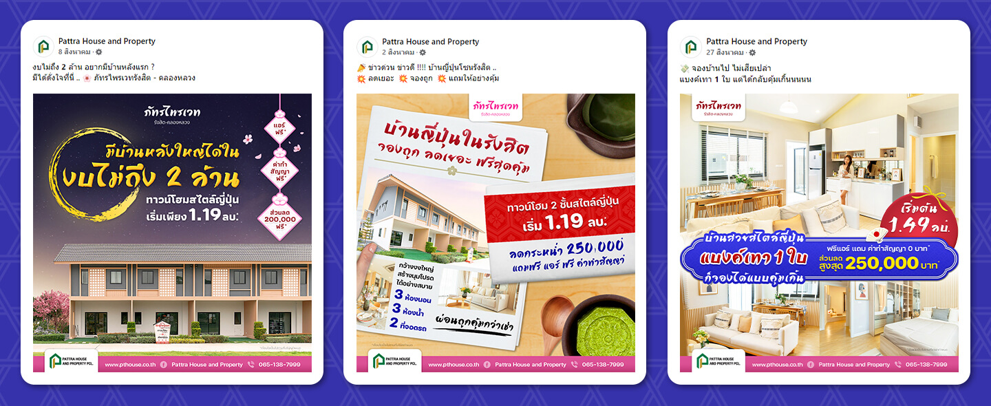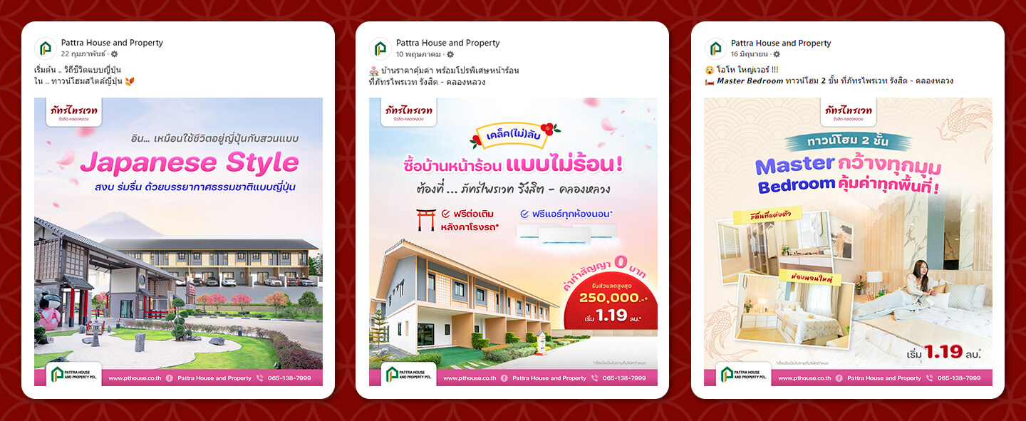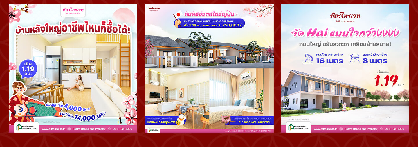 นำเอกลักษณ์สไตล์ญี่ปุ่นของโครงการ มาถ่ายทอดและผสานเข้ากับทุกโพสต์อย่างสวยงามและเหมาะสม เพื่อให้ผู้บริโภคได้จดจำลักษณะบ้านในโครงการได้ดี รวมถึงได้รับรู้ความคุ้มค่าจากโปรโมชั่นของโครงการในแต่ละเดือนได้มากขึ้น