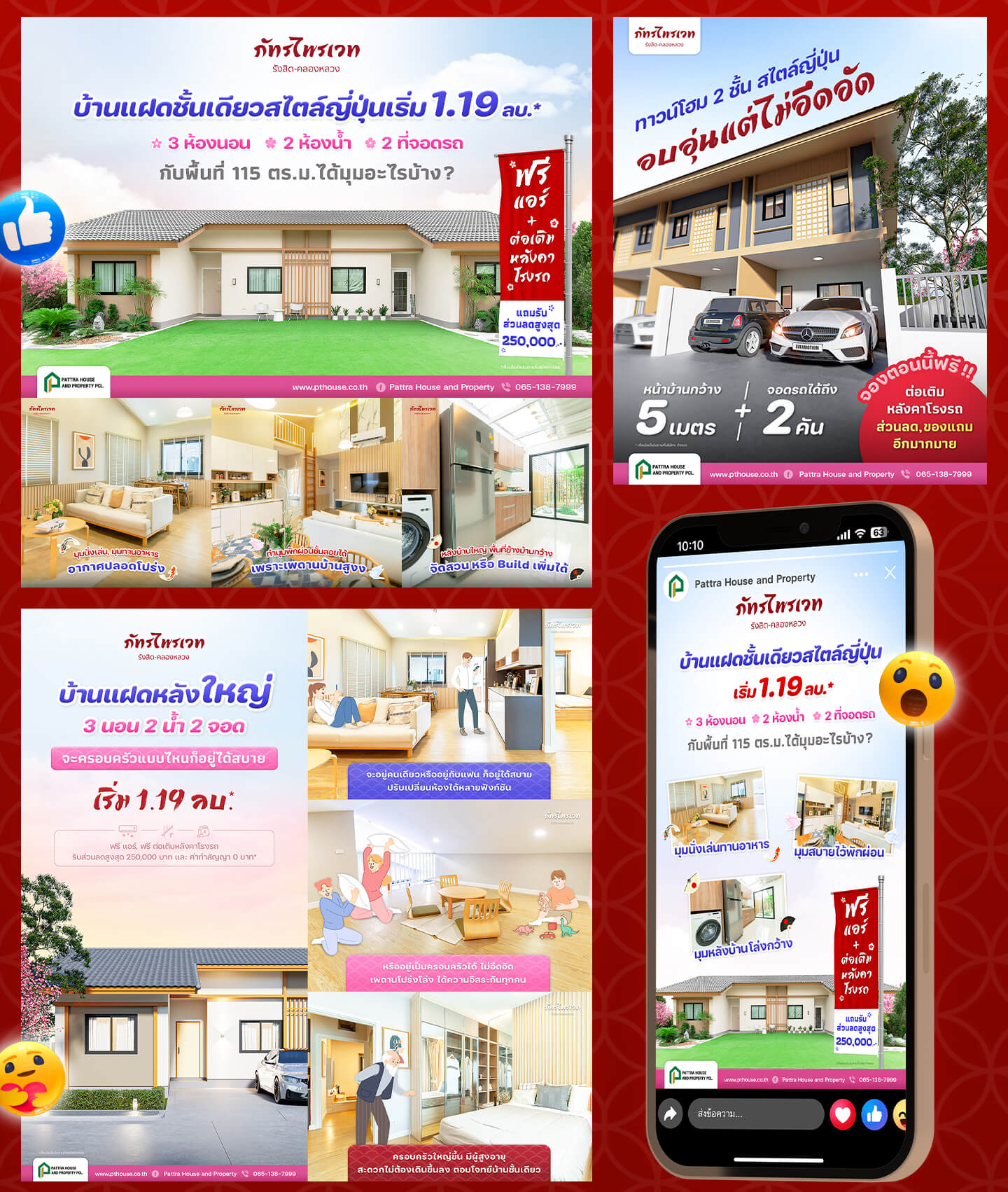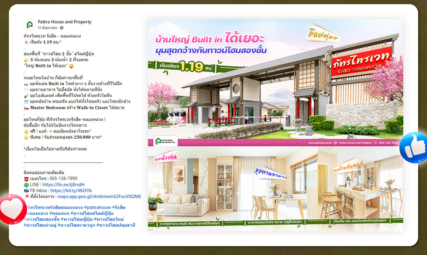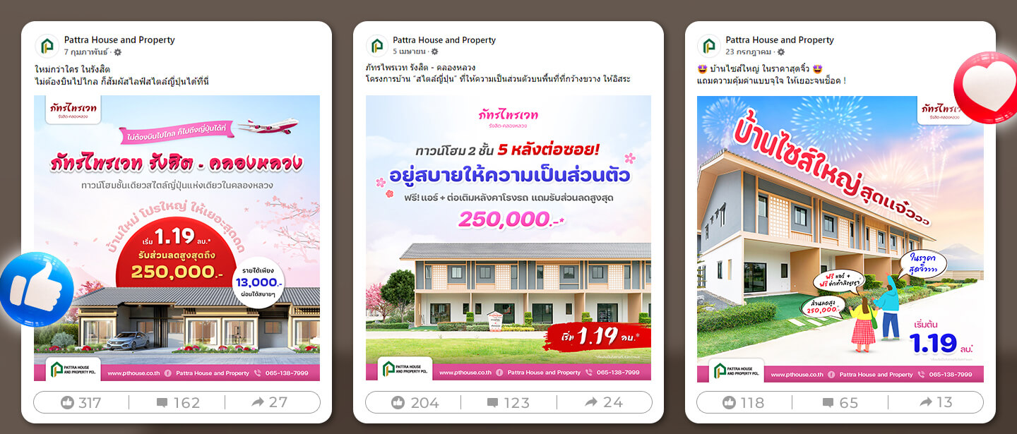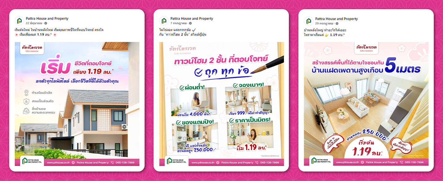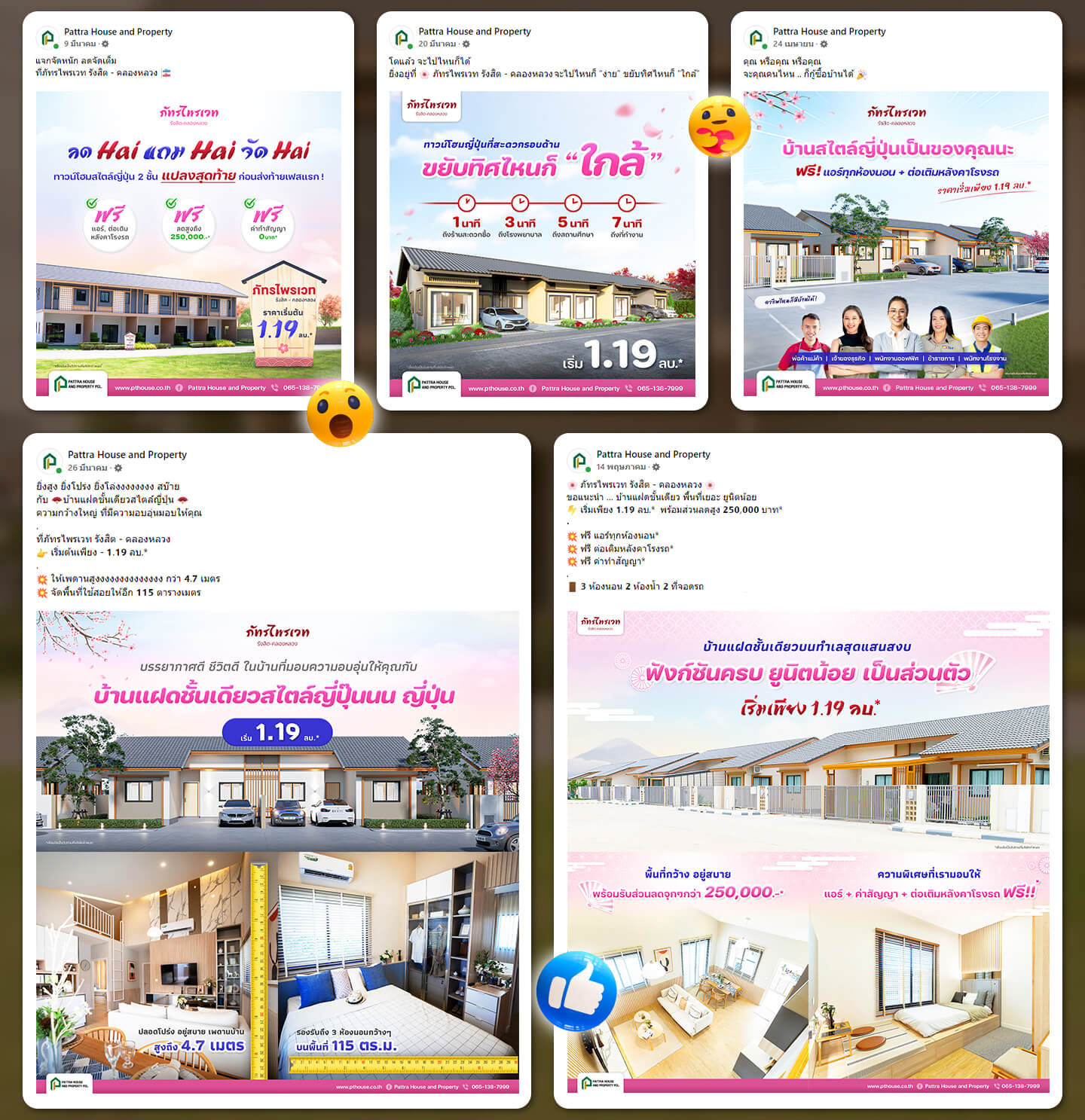 นำเอกลักษณ์สไตล์ญี่ปุ่นของโครงการ มาถ่ายทอดและผสานเข้ากับทุกโพสต์อย่างสวยงามและเหมาะสม เพื่อให้ผู้บริโภคได้จดจำลักษณะบ้านในโครงการได้ดี รวมถึงได้รับรู้ความคุ้มค่าจากโปรโมชั่นของโครงการในแต่ละเดือนได้มากขึ้น