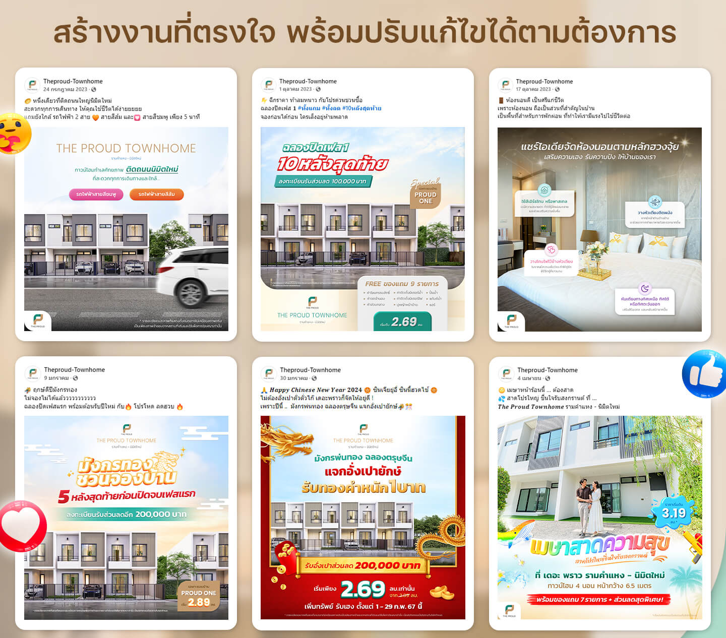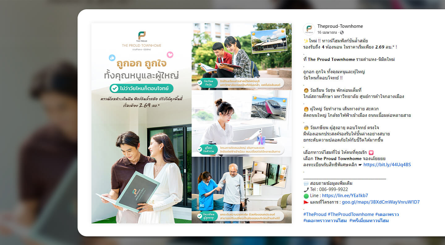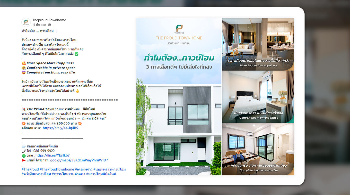 สร้างหน้าเพจให้ดูสวยงาม เป็นไปในทางเดียวกัน มีคอนเทนต์ที่หลากหลายเกี่ยวกับโครงการบ้าน ไม่ว่าจะเป็นการแนะนำการจัดห้อง การเลือกสีห้องต่าง ๆ หรือรวมไปถึงการให้ข้อมูลตามกระแสที่เกี่ยวโยงกับการมีบ้าน เช่น บอกฤกษ์ขึ้นบ้านใหม่ รวบรวมข้อมูลดอกเบี้ยจากแต่ละธนาคาร เพื่อกระตุ้นให้กลุ่มเป้าหมายได้มีส่วนร่วมกับโพสต์ต่าง ๆ มากขึ้น